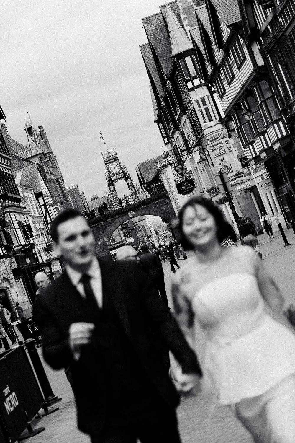 I’ve been fortunate enough that my career has taken me all over the world to capture weddings in some incredible places. But where I actually live, in the beautiful Roman city of Chester, I very rarely get to shoot, so when Nina & Konrad got in touch last year to book in for a 1 hour photoshoot in the city I was made up and have been looking forward to it since the start of the year. The couple got legally married earlier that morning in an intimate ceremony over in Wrexham and wanted some nice shots in their outfits before heading off for a meal at nearby Shrub. As I only had an hour to work with, we decided to start off with a quick walk around Chester Cathedral to take in the Museum of the Moon exhibition before heading down through Godstall Lane and down the high street with the famous Chester clock as our backdrop. I wanted to lean into some more editorial images and shoot some flash for these so I took the couple to Abbey Square, a nearby hidden gem of cobbled streets and vibrant town houses and got everything I needed in a few minutes. It isn’t always this easy to get plenty of great shorts on a tight schedule but these two were so comfortable with each other that I just stepped back and let them be and caught all the magic in the moments between them. When I posted some of these images to Instagram I did get a few messages along the lines of “OH MY GOD I FOLLOW THE BRIDE ON TIK TOK, SHE’S AMAZING!”, and yes in case you were wondering why you recognise her too she is better known as Nina.Nation on Tik-Tok and she makes fantastic videos all about the greatest thing in life which is of course food.